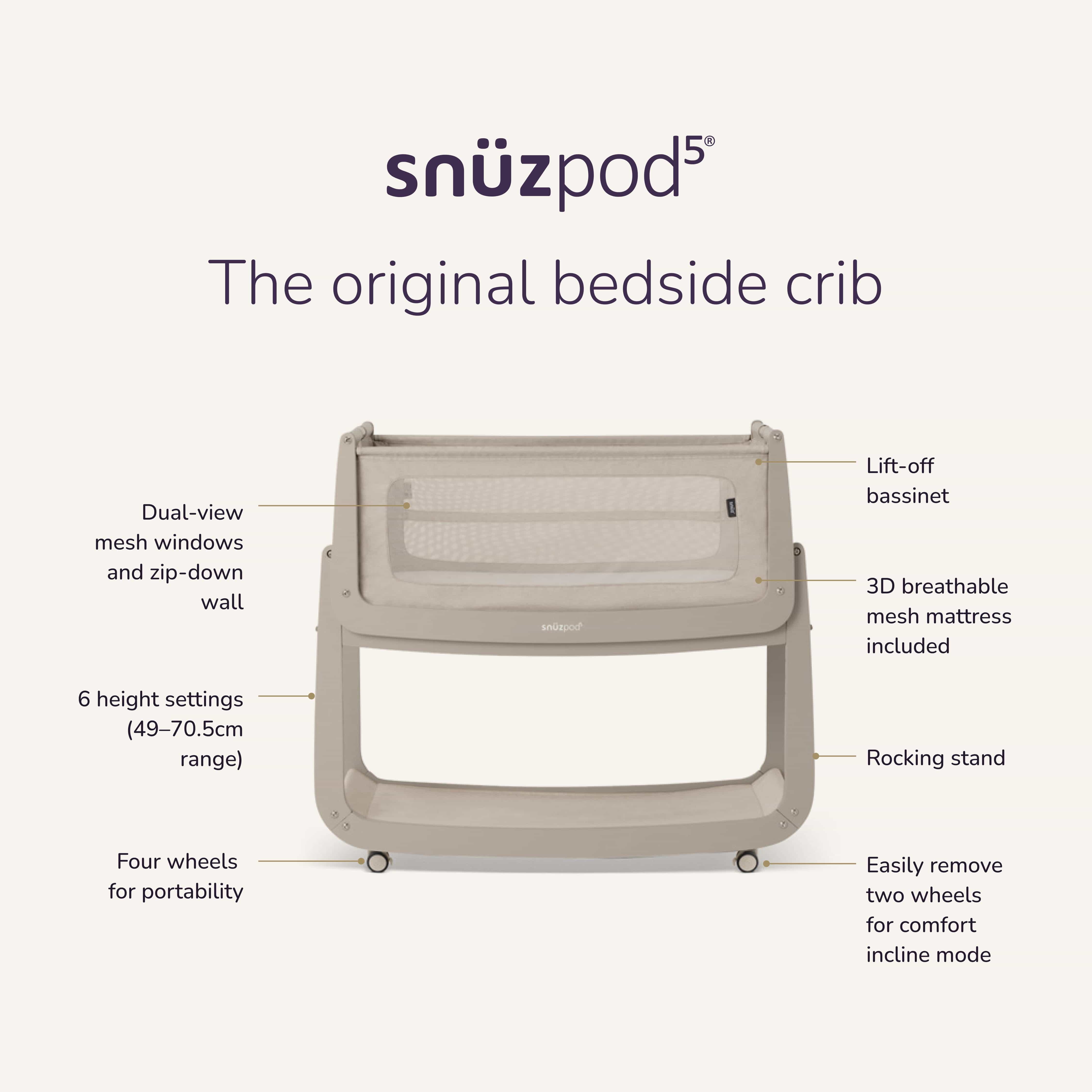 • Included: Breathable mattress certified and the perfect fit for SnuzPod5.