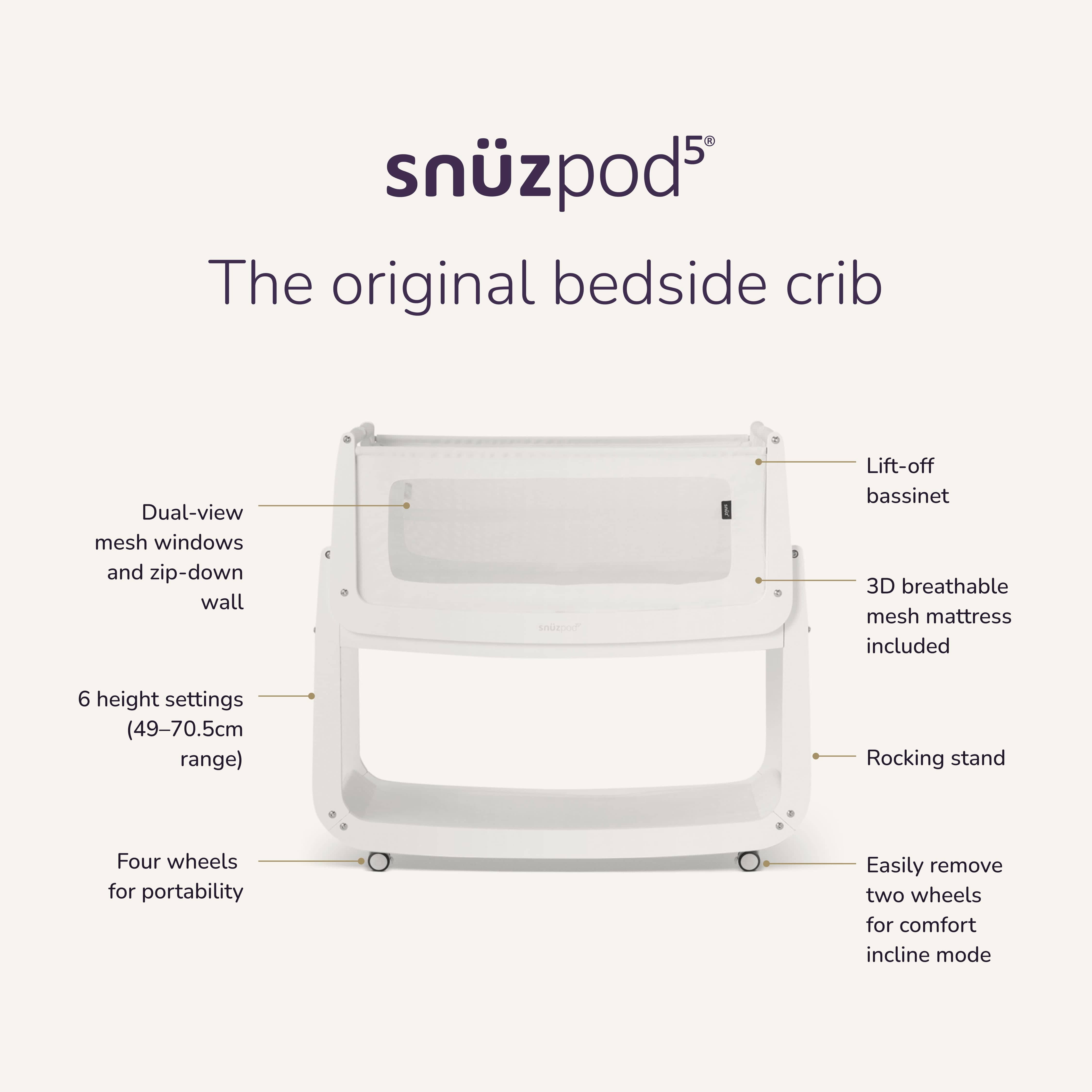 • Included: Breathable mattress certified and the perfect fit for SnuzPod5.