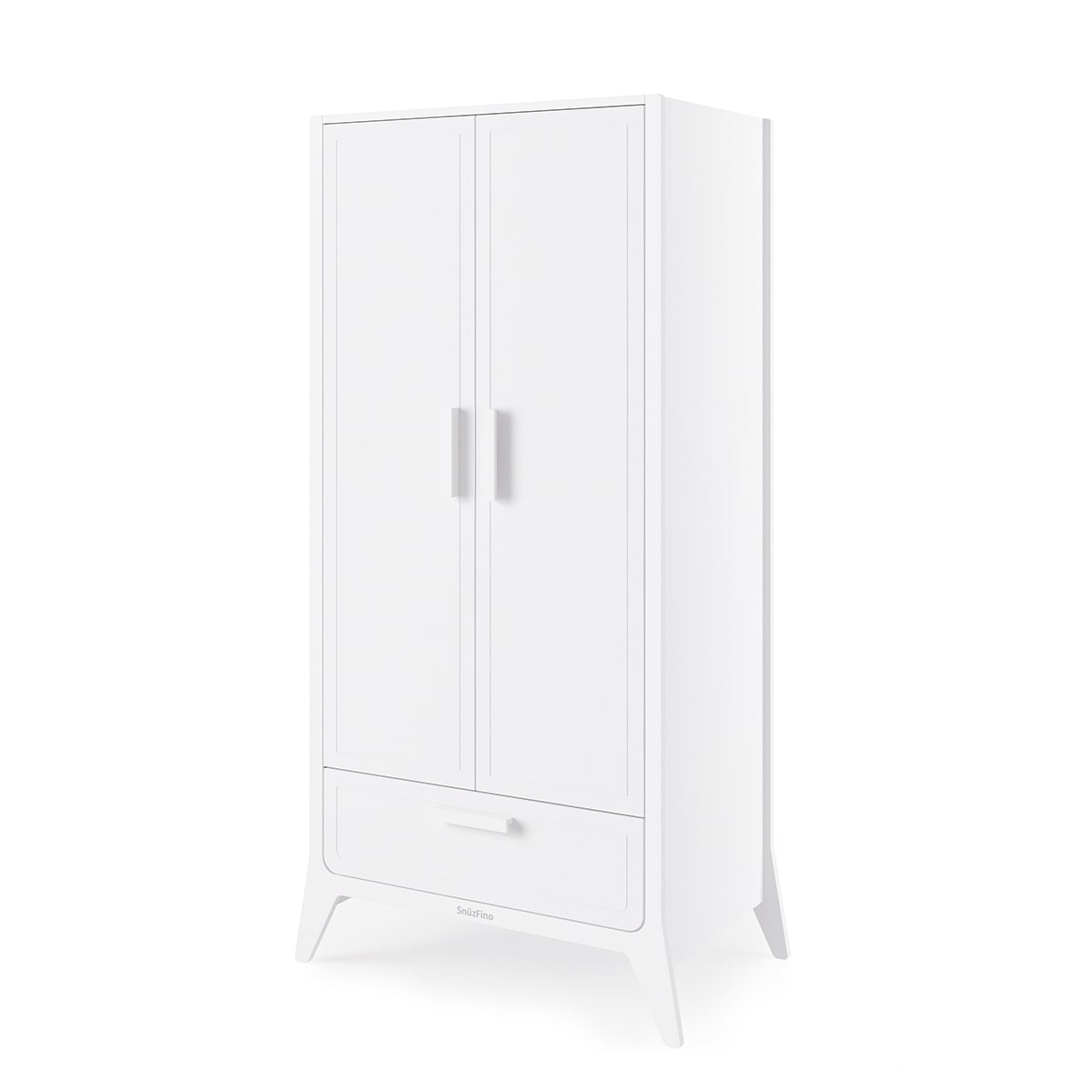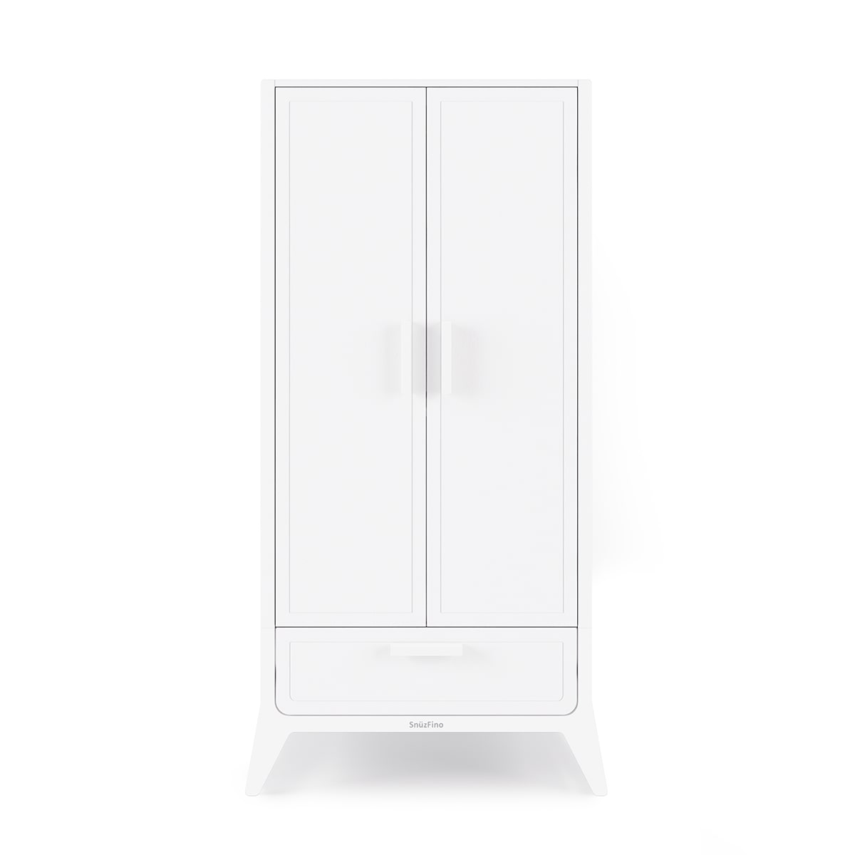 Discover true contemporary style with the SnuzFino 3-piece Nursery Furniture Set. Designed to last, the SnuzFino 3pc Cot Bed, Changing Unit and Wardrobe Set has all your nursery essentials covered. Growing with your child up to 4 years of age*, the SnuzFino Cot Bed easily converts into a toddler bed, with a unique arched canopy and toddler rails for extra security as they sleep (*toddler kit sold separately).